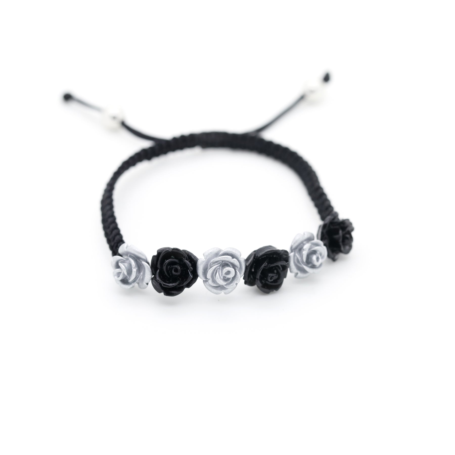 Silver and Black ceramic roses set to sit across your wrist, finished with soft black woven cotton thread