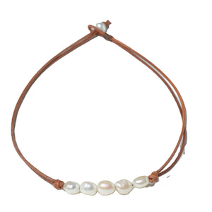 The natural leather in variated brown tones not only complements the pearls beautifully but also secures the loop over the pearl to close, adding a touch of rustic charm to the design.