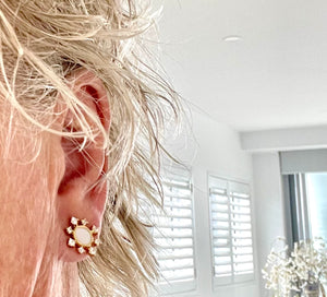 These Mother of Pearl studs sit perfectly on your lobe with a fine embellishment of scattered swarovski, Perfect for that vintage or classic special occasion look, or for a beautiful bride or bridesmaids.